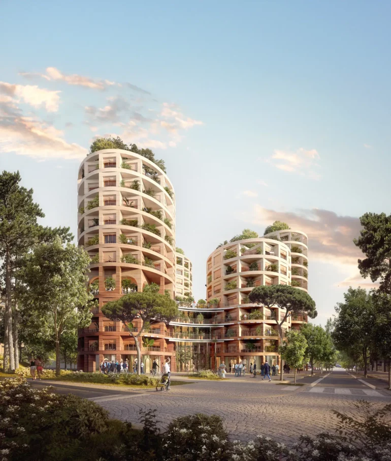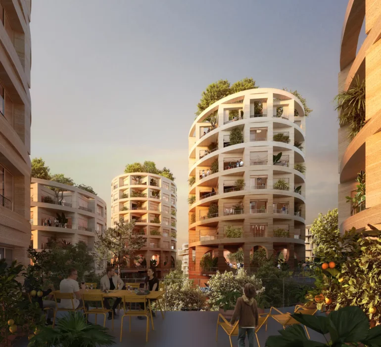 Vivre ensemble principalement en rdc (potagers collaboratifs, crèche, école d’art pour les enfants, atelier bricolage, orangeraie). Restaurant en Rdc complété par un bar à cocktail au R+10.
