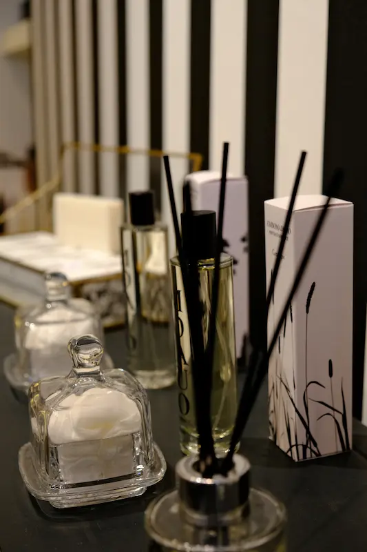 Dans un décor repensé, les senteurs fraîches des agrumes et des baies roses de l’Eau d’Arles se mêlent à celles de l’oud et de l’ambre de La Bête du Vaccarès. Ambiance boudoir chic en noir et blanc. Les rayures au mur nous rappellent le design graphique que le couple à réalisé pour Croisère. Le packaging a lui aussi évolué :