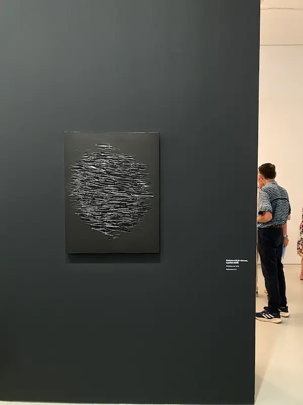 Suivent Bâtir la peinture, Écriture et silence plastique, Cette couleur violente, L’envers du noir et L’espace de la peinture. Intense, radicale, l’exposition s’intéresse à l’architecture des œuvres comme au rapport de l’artiste à l’écriture et au signe. Dans une quatrième séquence, la couleur jaillit, toujours plus lumineuse sur fond noir. Elle fait dialoguer les recherches du peintre sur la lumière avec des toiles de Zurbarán, Van Gogh et Rembrandt.