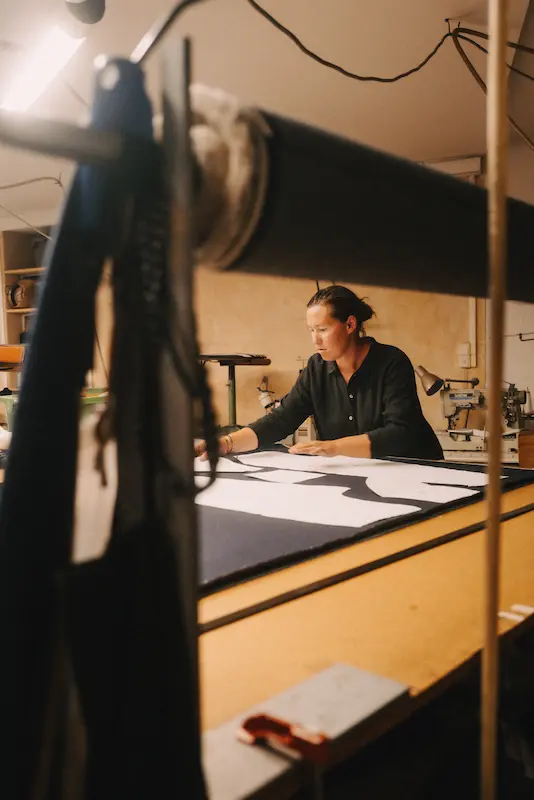 Charlotte Le Stum dessine, patronne et monte les vêtements dans son atelier. Situé en plein cœur de Nîmes, au niveau inférieur de l’espace de vente de sa marque, il voisine avec le Square Antonin, le Quai de la Fontaine et la Maison Carrée. Autodidacte, la créatrice a appris en démontant les vêtements pour en comprendre les structures. Puis s’est entourée de stylistes et d’un bureau d’étude avant d’apprendre le patronage et les gradations. Fabriqués à Nîmes, les vêtements sont conçus pour résister à l’épreuve du temps, avec un choix de tissus de qualité. Le Vestiaire de Jeanne travaille beaucoup le lin, sourcé principalement en Italie. Le label a par ailleurs créé une ligne de vêtements avec la toile de jean du fabricant nîmois Ateliers de Nîmes.