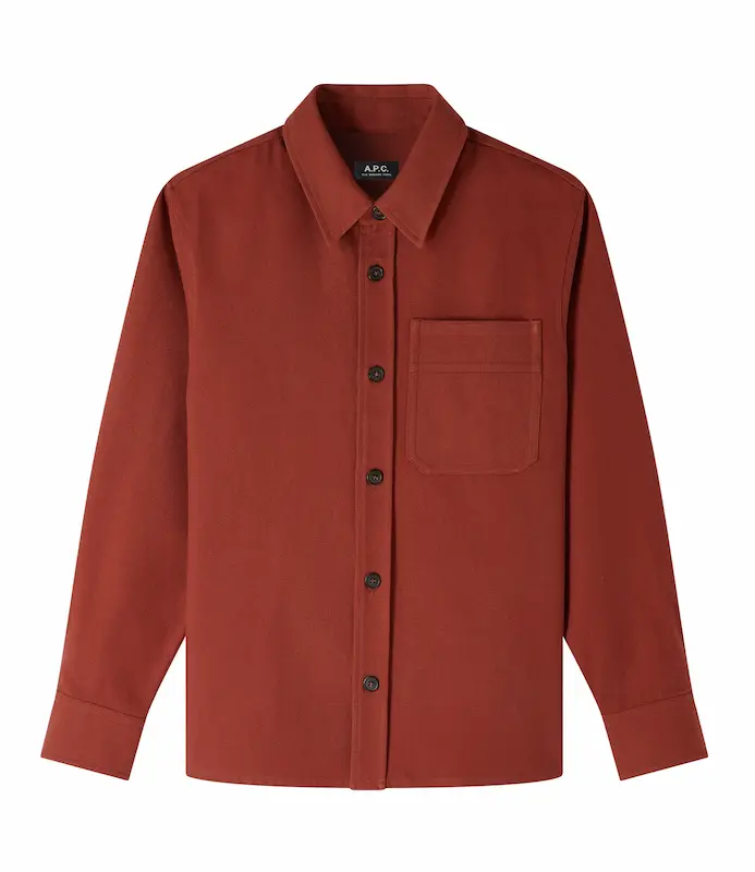 Couleur marron glacé en denim bio recyclé ou brique en coton recyclé, la surchemise brodée ton sur ton Basile d’A.P.C. a une coupe très légèrement oversized, des tonalités automnales et des épaules tombantes pour un porté cool sur un tee-shirt blanc.