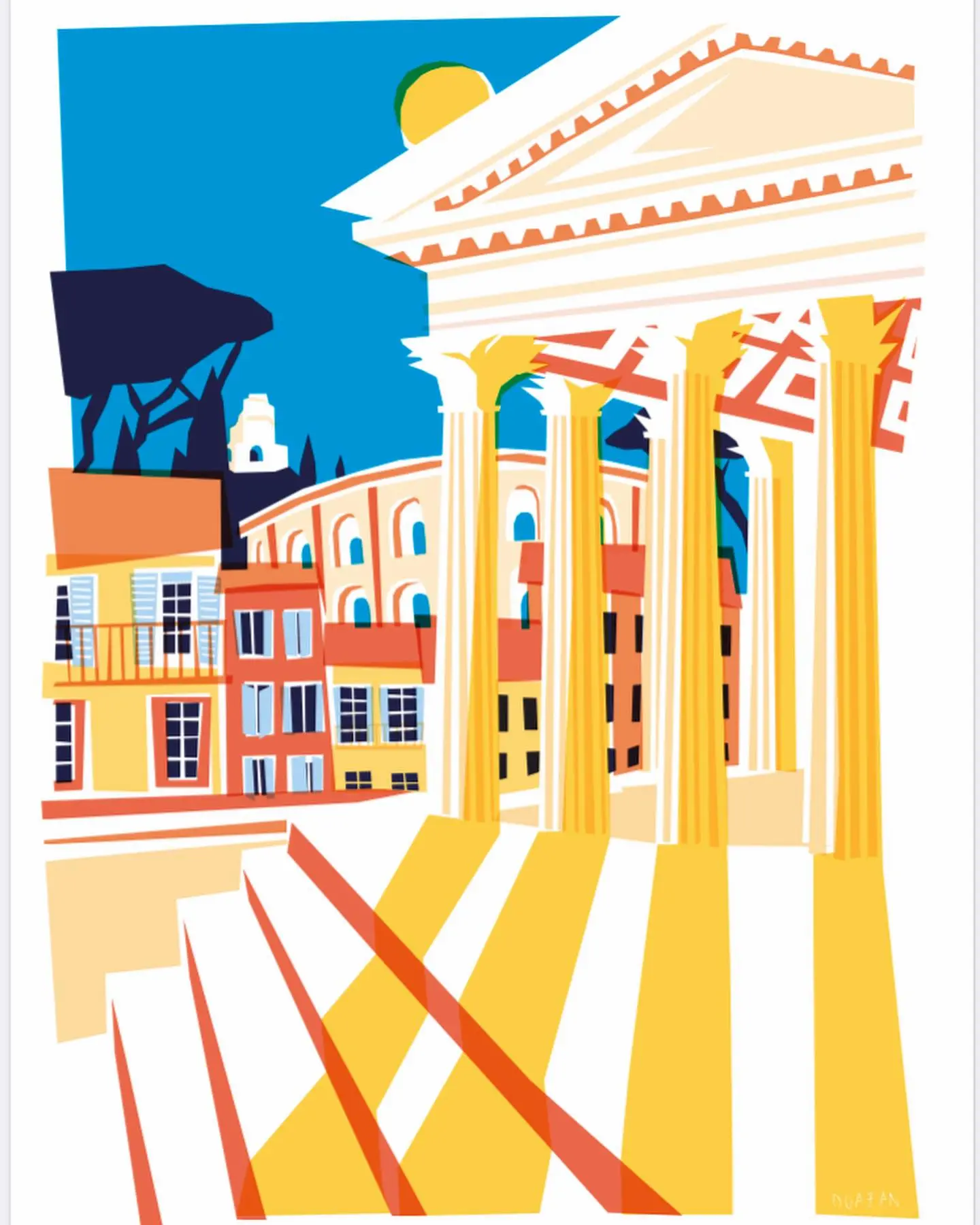 Formée à Olivier de Serres (Paris) et très inspirée par les affichistes de la moitié du 20e siècle comme Raymond Savignac ou Bernard Villemot, Marie Doazan a été invitée par Nîmes s’illustre à créer une nouvelle affiche patrimoniale dans le cadre de leur collaboration avec l’Office de Tourisme.